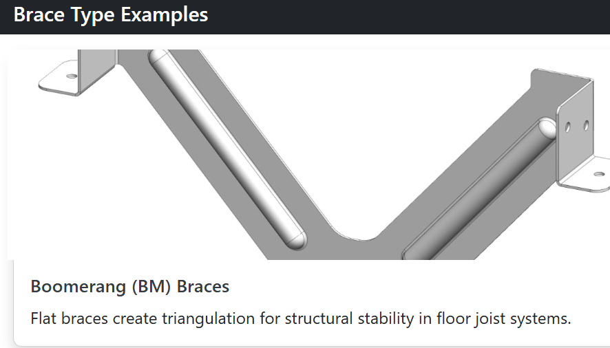 V-shaped Boomerang brace configuration with dimple feature provides superior structural triangulation between joists.